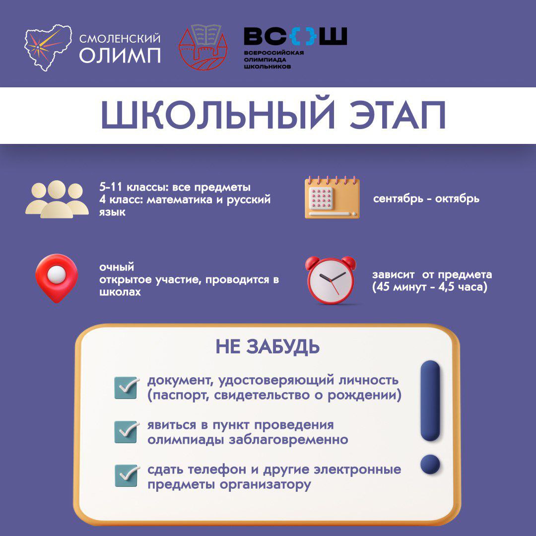 • в сентябре-октябре школьный этап (в нем могут принять участие все желающие школьники 4-11 классов);