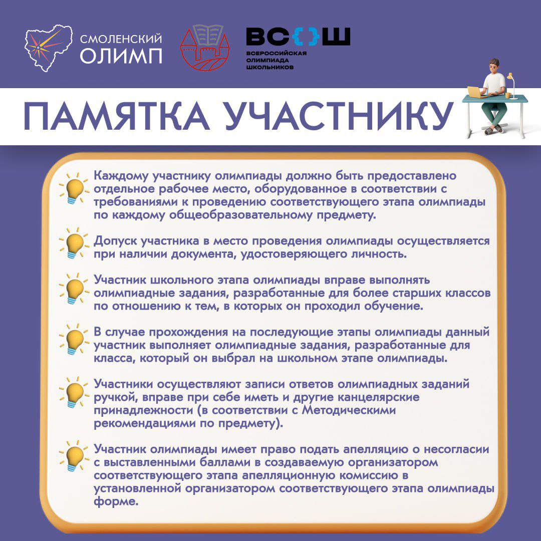 Регистрация участников на школьный этап ВсОШ осуществляется через подачу заявки в автоматизированную информационную систему «Смоленский Олимп». Ссылки на регистрацию по каждому общеобразовательному предмету располагаются на сайте Регионального центра «Смоленский Олимп» во вкладке «Конкурсы и олимпиады» - «ВСОШ» - «Школьный этап ВсОШ» (https://smololimp.ru/konkursi-i-olimpiadi/vsosh/shkolnii-etap-vsosh).